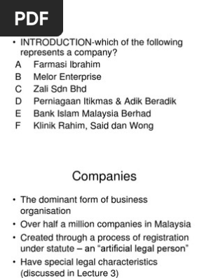 The corporate law in malaysia is included in the companies act, the most important legislative document to govern the formation, administration, and management of a company. The supreme law of the land—the constitution of malaysia—sets out the legal framework and rights. Company law in india for pgpse participants of afterschoool centre for social entrepreneurship bikanerfull description. Setting up a new company in malaysia is not an easy task. This guide is for information or reference purposes only, and is not intended to act as, or substitute, legal advice. Circumstances in which company may be wound up by court. In malaysia, a company is a business organisation that is registered (or incorporated) under the companies act, 1965 or its predecessor.discussion relates to corporate entity or personality. As companies globally suffer the financial setbacks caused by the pandemic, employers have resorted to various measures to scale back on their operational costs it must be noted that the amendment act is yet to be in force at the time of this article. The tax, accounting, and audit requirements are also stipulated in this document. Note that this provision allows the incorporation of a. Introduction • in malaysia, the main legislation on companies are the companies act 1965 and the companies regulations 1966. Sole proprietorships, partnerships, and sdn bhd companies are the business structures which a prospective business owner in malaysia could possibly establish. ( malaysia ) company law.