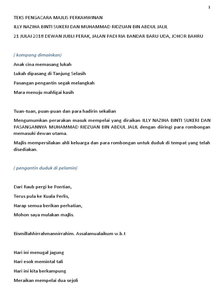 Teks Pengacara Majlis Perkahwinan Sampel Pada 25 Mei Lalu from reader017.dokumen.tips Dengan diiringi selawat ke atas junjungan kita baginda nabi muhammad saw Teks pengacara majlis pertandingan syarahan dan ujian bertulis. Di bawah ini adalah skrip doa majlis perkahwinan yang biasa dibaca oleh emcee/pengacara majlis isda catering. Selamat datang ke majlis makan malam , setahun bersama seabad terasa. Pagi yang indah penuh ceria. Saya merupakan seorang emcee atau pengacara yang telah mengacara majlis seperti majlis perkahwinan, karnival, anniversary. Mengumumkan ketibaan yang diraikan puan bedah bt. Merekalah orang yang akan membuat pengumuman dan memberi.